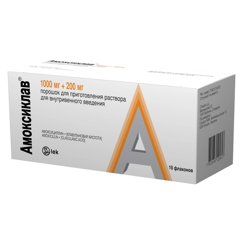 Амоксиклав 1000 мг+200 мг порошок для приготовления раствора для внутривенного введения 10 шт