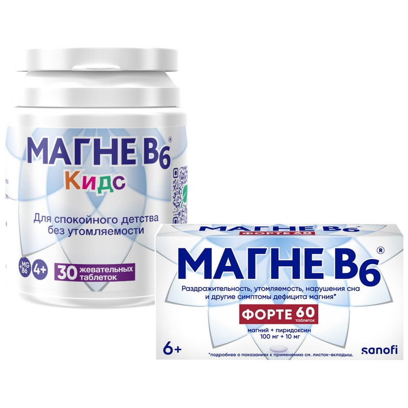 Цены на Набор Магне В6 Форте таблетки 60 шт + Магне В6 Кидс таблетки жевательные для детей 30 шт в аптеках Москвы