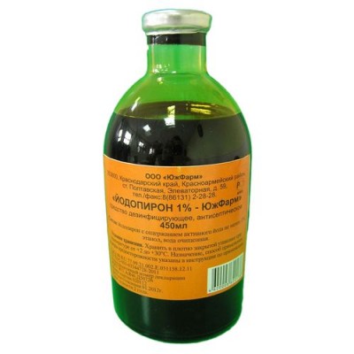 Йодопирон спрей - коричневая прозрачная жидкость с невыраженным специфическим запахом. Антимикробная активность: Средство дезинфицирующее «Йодопирон 1%- ЮжФарм» при местном применении проявляет бактерицидное (в отношении широкого спектра грамположительных и грамотрицательных микроорганизмов, в т.ч. антибиотико-резистентных штаммов кишечной палочки, золотистого стафилококка и протея), фунгицидное и противовоспалительное действие, обладающее вирулицидной активностью. Сохраняет высокие антисептические свойства йода, даже в присутствии крови, плазмы, не вызывает развития резистентных форм микроорганизмов, не оказывает аллергического воздействия на организм, средство не токсично. Средство обладает пролонгированной антимикробной активностью не менее 5 часов. Средство сохраняет свои свойства после замораживания и последующего оттаивания. Назначение: Средство «Йодопирон 1 % -ЮжФарм» предназначено для применения в лечебно-профилактических учреждениях: для гигиенической обработки рук медицинского персонала; для обработки рук хирургов, операционных медицинских сестер, акушерок и других лиц, участвующих в проведении операций и приеме родов; для обеззараживания кожи операционного и инъекционного полей; для обработки локтевых сгибов доноров; для обработки кожи перед введением катетеров и пункцией суставов; для гигиенической обработки рук послеоперационного и инъекционного поля населением в быту; для обработки ссадин и порезов в быту; для протирания мест укуса насекомыми (ослабляет неприятные ощущения и зуд); для комплексной защиты кожи от микробов в общественных местах, на природе.