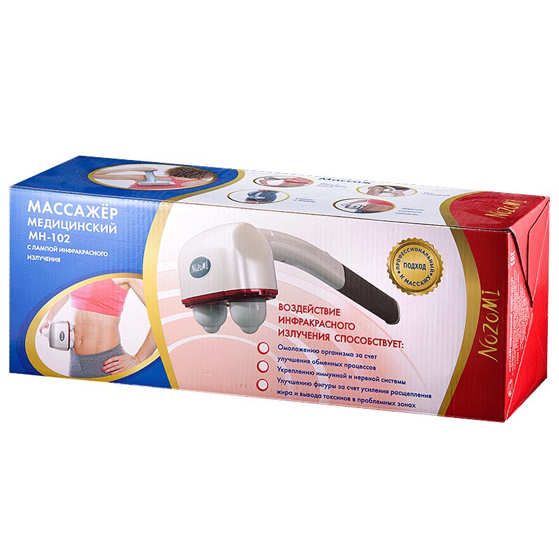 Медицинский массажёр Nozomi MH-103 обеспечивает интенсивный массаж, который способствует снятию тяжести и напряжения мышц, а также улучшает и стимулирует циркуляцию крови и иммунитет. Отличительными функциональными особенностями массажёра Nozomi MH-103 являются: • Четыре массажные насадки - оказывают массажное воздействие за счёт высокоскоростной вибрации, обеспечивают интенсивный и глубокий массаж • Две скорости вибрации: 9 000 ± 10 % и 12 000 ± 10 % уд/мин • Встроенный ионизатор - включается отдельной кнопкой, отрицательно заряженные ионы оказывают благотворное воздействие на организм • Длинная эргономичная ручка с удобным хватом - позволяет массировать все тело (включая спину) самостоятельно • Мощный