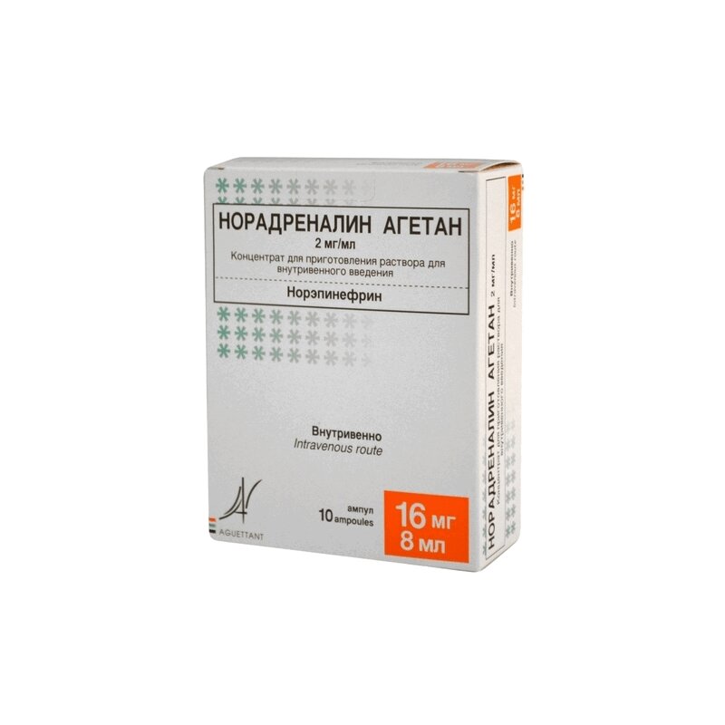 Норадреналин Агетан 2 мг/мл концентрат для приготовления раствора для внутривенного введения 8 мл 10 шт
