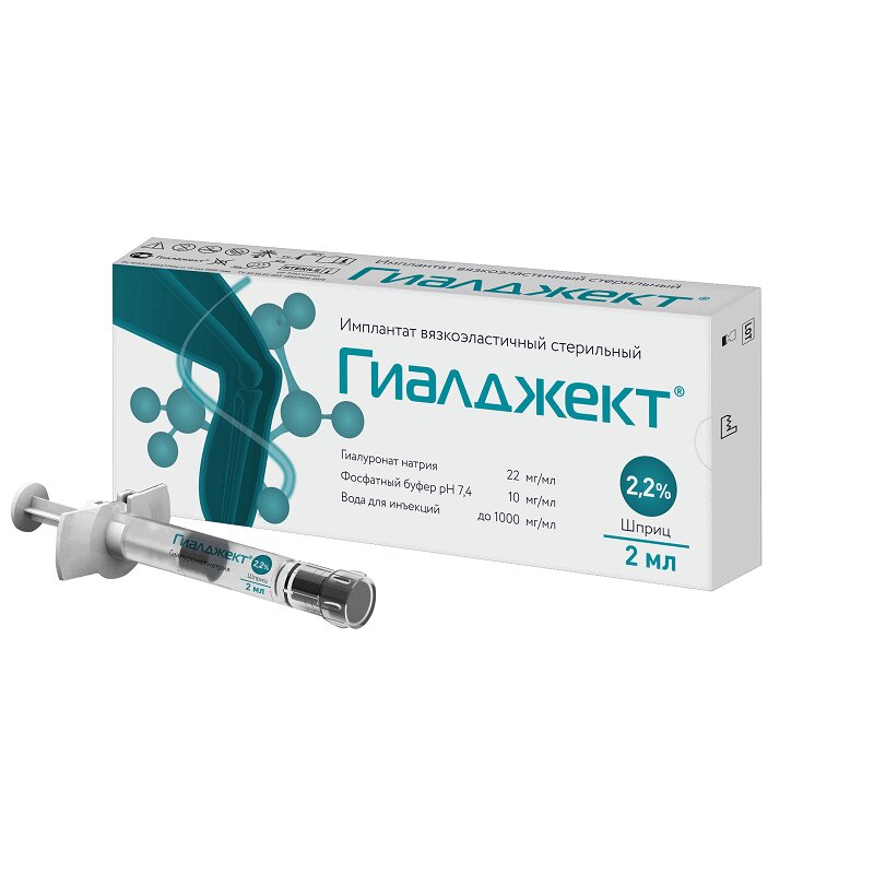 Вязкоэластичные свойства гиалуроновой кислоты, входящей в состав синовиальной жидкости, обеспечивают смазывание и амортизацию суставных поверхностей. Синовиальная жидкость в суставах при дегенеративных заболеваниях (остеоартроз) или травматических изменениях суставов, имеет более низкую вязкость и эластичность, чем в здоровых суставах. Гиалуроновая кислота, входящая в состав Импланта ГИАЛДЖЕКТ, имеет молекулярную массу 2,2 млн. дальтон, близкую к естественной гиалуроновой кислоте человека, и оказывает положительный эффект после введения при диагнозе остеоартроз (остеоартрит). Внутрисуставное введение Имплантата ГИАЛДЖЕКТ восстанавливает физиологические и реологические свойства синовиальной жидкости сустава, пораженного остеоартрозом. Вследствие этого уменьшается боль и дискомфорт, улучшается подвижность в суставе.