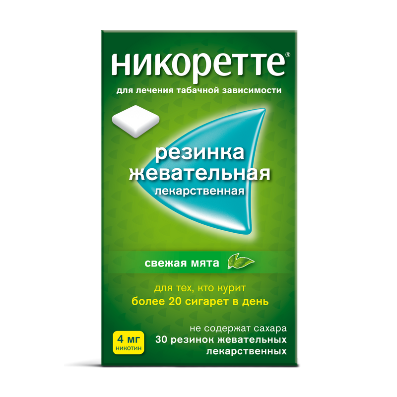 ОПИСАНИЕ Для дозировки 2 мг: квадратная, покрытая оболочкой белого или почти белого цвета подушечка с запахом мяты размером приблизительно 15×15×6 мм. Для дозировки 4 мг: квадратная, покрытая оболочкой светло-желтого с коричневатым или зеленоватым оттенком цвета подушечка c запахом мяты размером приблизительно 15×15×6 мм. Для обеих дозировок допускается наличие небольших неровностей по бокам. ФАРМАКОЛОГИЧЕСКИЕ СВОЙСТВА Фармакотерапевтическая группа: средство для лечения никотиновой зависимости Код АТХ: N07BA01 Фармакодинамика После резкого отказа от курения у пациентов, ежедневно использовавших табакосодержащие продукты в течение длительного времени, возможно развитие синдрома отмены, который включает в себя: дисфорию, бессонницу, повышенную раздражительность, тревогу, нарушение концентрации внимания, снижение частоты сердечных сокращений, увеличение аппетита или прибавку в весе. Важным симптомом синдрома отмены является также желание курить. При лечении табачной зависимости заместительная терапия никотином снижает потребность в числе выкуриваемых сигарет и стиков для систем нагревания табака, снижает выраженность симптомов отмены, возникающих при полном отказе от курения у тех, кто решил бросить курить; облегчает временное воздержание от курения, а также способствует уменьшению количества выкуриваемых сигарет и стиков для систем нагревания табака у тех, кто не может или не хочет полностью отказаться от курения. Фармакокинетика Никотин, поступающий из жевательной резинки, быстро всасывается через слизистую оболочку щеки и обнаруживается в крови через 5-7 минут. Максимальная концентрация никотина достигается через 30 минут после начала жевания. Объем распределения никотина при внутривенном введении равняется около 2-3 л/кг, а период полувыведения – примерно 2 ч. Никотин в основном выводится печенью, его средний плазменный клиренс составляет около 70 л/ч. Никотин метаболизируется также в почках и легких. Идентифицировано более 20 метаболитов никотина, которые уступают ему по активности. Связь никотина с белками плазмы составляет менее 5%. В связи с этим нарушения связывания никотина при одновременном применении других препаратов или изменения уровней белков плазмы при различных заболеваниях не должны оказывать существенного влияния на кинетику никотина. Первичный метаболит никотина в плазме – котинин – обладает периодом полувыведения 15-20 ч, а его концентрация превышает таковую никотина в 10 раз. С мочой выводятся в основном котинин (15% дозы) и транс-3-гидрокси-котинин (45% дозы). От 10% до 30% дозы никотина выводится с мочой в неизмененном виде. Прогрессирующее ухудшение функции почек сопровождается снижением общего клиренса никотина. Его фармакокинетика не меняется у больных циррозом печени с незначительно выраженными нарушениями функции печени (индекс 5 по Чайлд-Пью) и снижается у больных циррозом печени с умеренным нарушением функции печени (индекс 7 по Чайлд-Пью). У курильщиков, получавших лечение гемодиализом, отмечали повышение концентрации никотина в плазме крови. У пожилых пациентов отмечается небольшое снижение общего клиренса никотина, что не требует коррекции дозы. ПОКАЗАНИЯ К ПРИМЕНЕНИЮ Лечение табачной зависимости путем снижения потребности в никотине в следующих случаях: • уменьшение симптомов отме