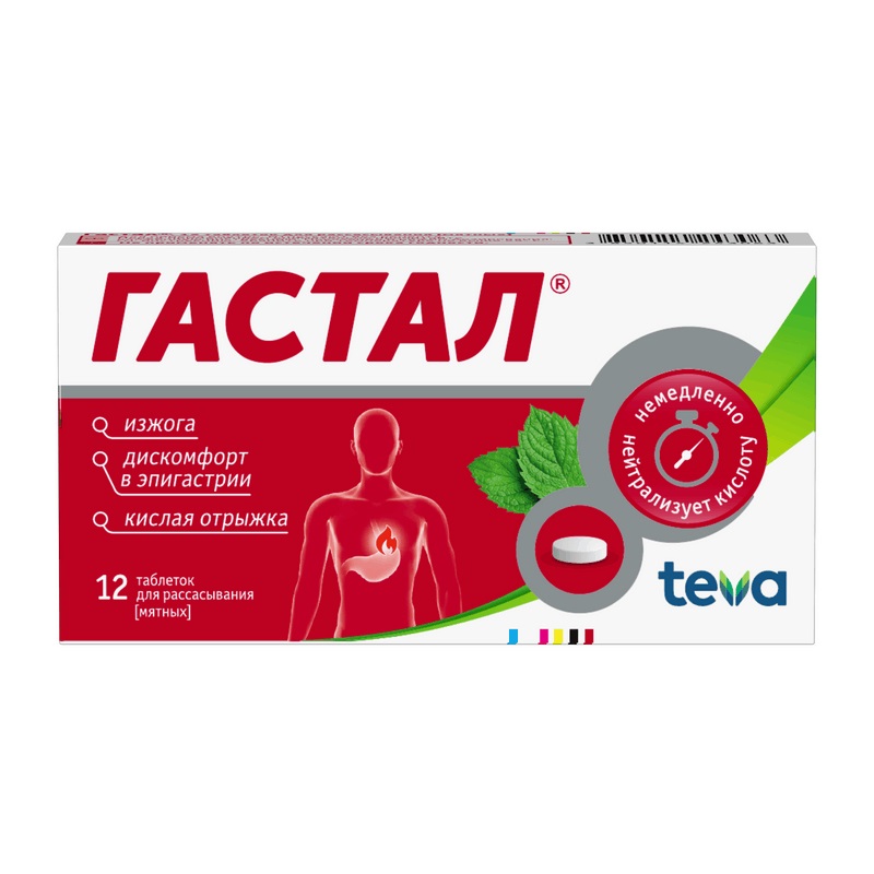 Антацидное действие препарата проявляется сразу после приема таблеток Гастала и продолжается около 2 ч. 1 таблетка Гастала нейтрализует около 21.5 ммоль соляной кислоты. Гастал ингибирует действие пепсина, лизолецитина и желчных кислот, таким образом, также устраняя расстройства функции желудка.