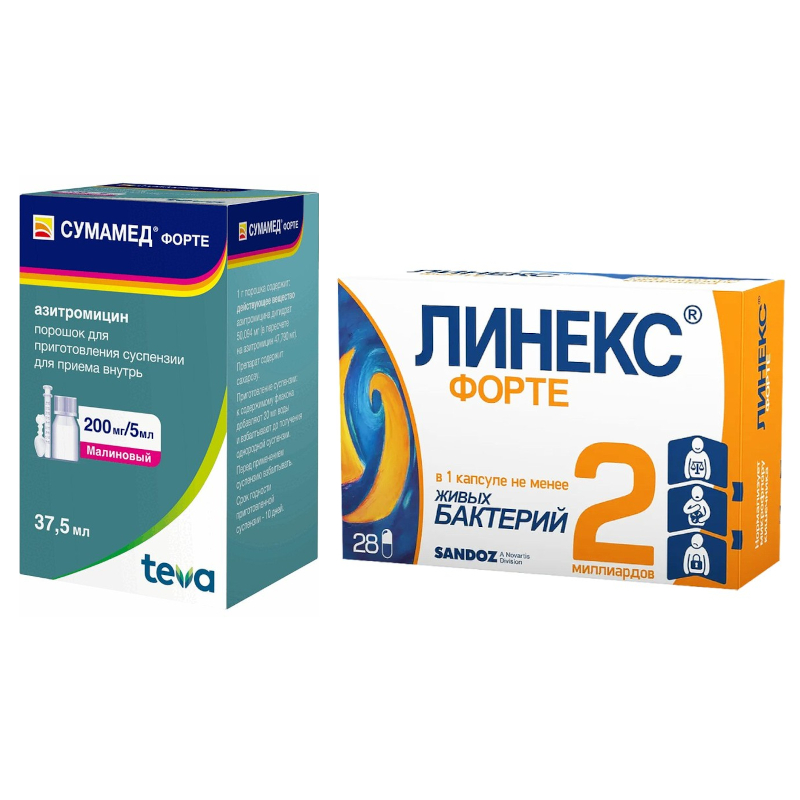 Источники аннотации Набор Сумамед Форте 200 мг/5 мл порошок для приготовления суспензии Малина 37,5 мл + Линекс Форте капсулы 28 шт
