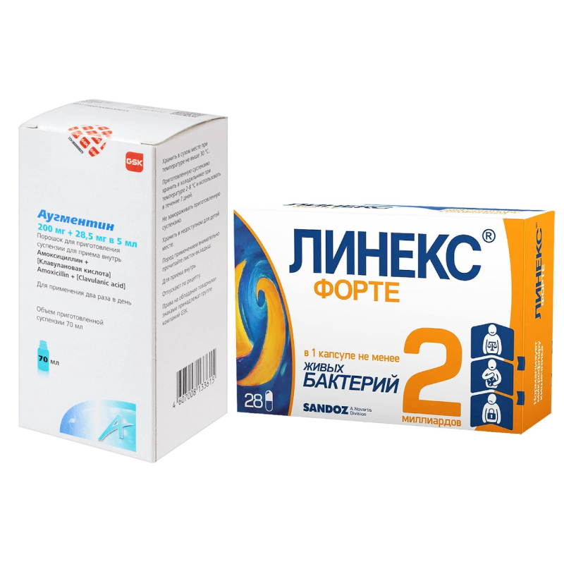 Набор Аугментин 200 мг+28,5 мг/5 мл порошок для приготовления суспензии для приема внутрь 7,7 г + Линекс Форте капсулы 28 шт