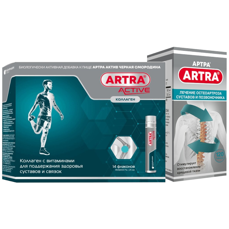 Набор Артра 500 мг+500 мг таблетки покрытые пленочной оболочкой 120 шт + Артра Актив раствор для приема внутрь Черная смородина 25 мл 14 шт
