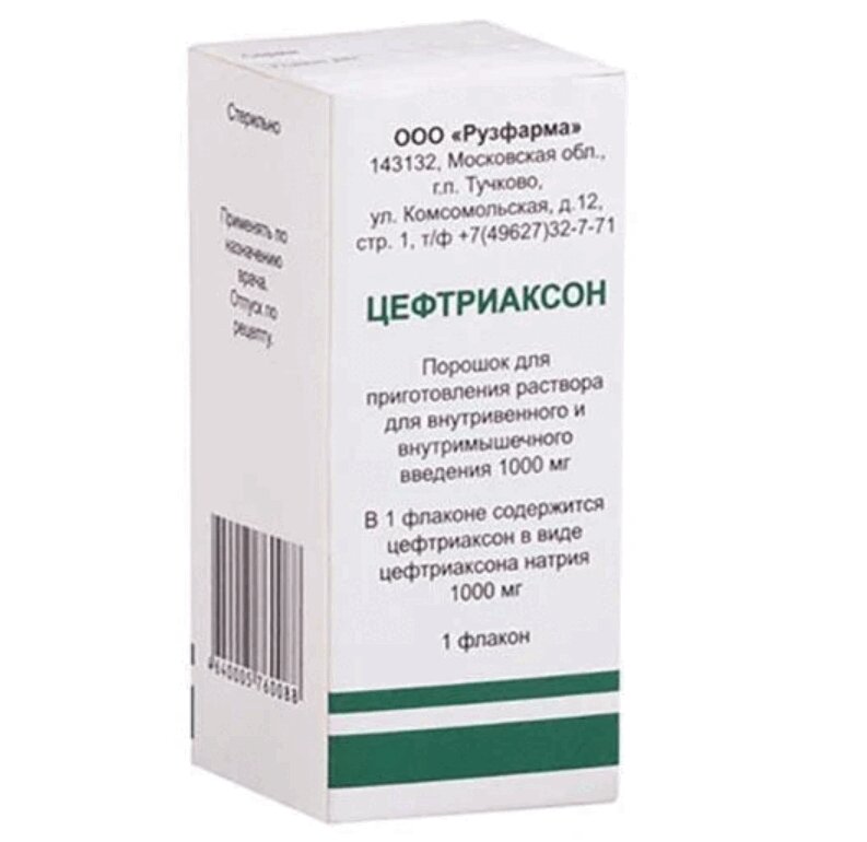Цефтриаксон 1000 мг порошок для приготовления раствора для внутривенного и внутримышечного введения 1 шт Рузфарма