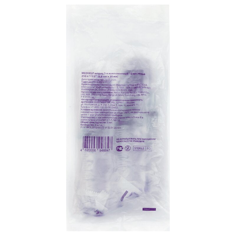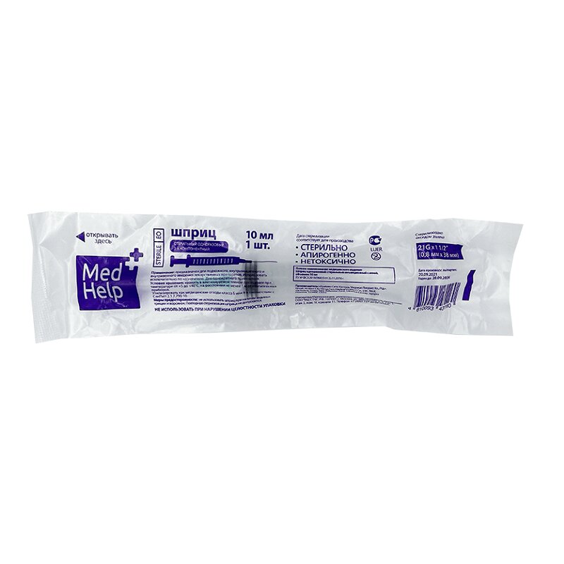 MedHelp Шприц 3-х компонентный 20 мл с иглой 21G (0,8х38мм) 5 шт