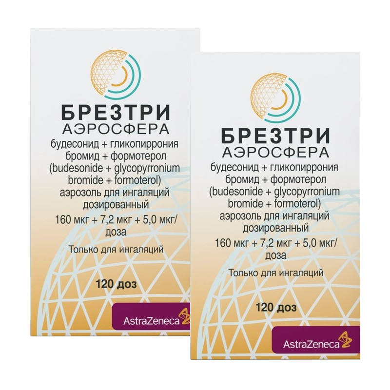 Ингалятор: Баллон с белой насадкой, прикрепленной к баллону со стороны клапана, и индикатором доз в виде щитка с экраном со шкалой, соответствующей количеству доз в ингаляторе (120). Баллон снабжен распыляющим устройством желтого цвета с защитным серым колпачком. Содержимое баллона: Порошок белого цвета. Фармакодинамические свойства Фармакотерапевтическая группа: средства для лечения обструктивных заболеваний дыхательных путей; адренергические средства для ингаляционного введения; адренергические средства в комбинации с антихолинергическими средствами, включая тройные комбинации с глюкокортикоидами. Код АТХ: R03AL11 Механизм действия Препарат БРЕЗТРИ АЭРОСФЕРА содержит глюкокортикостероид, будесонид, и два бронходилататора: гликопирроний, антагонист мускариновых рецепторов длительного действия (антихолинергик), и формотерол, агонист β2-адренорецепторов длительного действия. Комбинация данных веществ с различными механизмами действия приводит к повышению эффективности в сравнении с применением любой двухкомпонентной терапии. Будесонид после ингаляции оказывает быстрое (в течение нескольких часов) и дозозависимое противовоспалительное действие в дыхательных путях, снижая выраженность симптомов и частоту обострений ХОБЛ. При применении ингаляционного будесонида отмечается меньше тяжелых нежелательных эффектов по сравнению с системными глюкокортикостероидами. Гликопирроний является антагонистом мускариновых рецепторов длительного действия, который часто называют антихолинергиком. Основными мишенями антихолинергических средств являются мускариновые рецепторы, находящиеся в дыхательных путях. Гликопирроний обладает быстрым началом действия и схожим сродством к подтипам М1–М5 мускариновых рецепторов. В дыхательных путях бронходилатация достигается путем ингибирования М3-рецепторов гладкой мускулатуры. Данный антагонизм является конкурентным и обратимым. Подавление бронхосуживающего воздействия, вызванного метилхолином и ацетилхолином, было дозозависимым и длилось более 12 часов. Формотерол является селективным β2-адреномиметиком, который после ингаляции приводит к быстрому и длительному расслаблению гладкой мускулатуры бронхов у пациентов с обратимой обструкцией дыхательных путей. Бронходилатация достигается за счет непосредственного расслабления гладкой мускулатуры дыхательных путей вследствие повышения уровня циклического аденозинмонофосфата (АМФ) после активации аденилатциклазы. Бронходилатирующее действие дозозависимое и начинается в течение 1-3 минут после ингаляции. Продолжительность действия после однократной дозы составляет не менее 12 часов. Вследствие различия плотности мускариновых и β2-адренорецепторов в центральных и периферических дыхательных путях антагонисты мускариновых рецепторов более эффективны в расслаблении центральных дыхательных путей, а агонисты β2-адренорецепторов – периферических дыхательных путей, таким образом применение комбинированной терапии может усиливать благоприятное воздействие на функцию легких. Клиническая эффективность и безопасность Эффективность и безопасность препарата БРЕЗТРИ АЭРОСФЕРА была оценена в двух рандомизированных двойных слепых исследованиях в параллельных группах у пациентов с ХОБЛ от средней до очень тяжелой